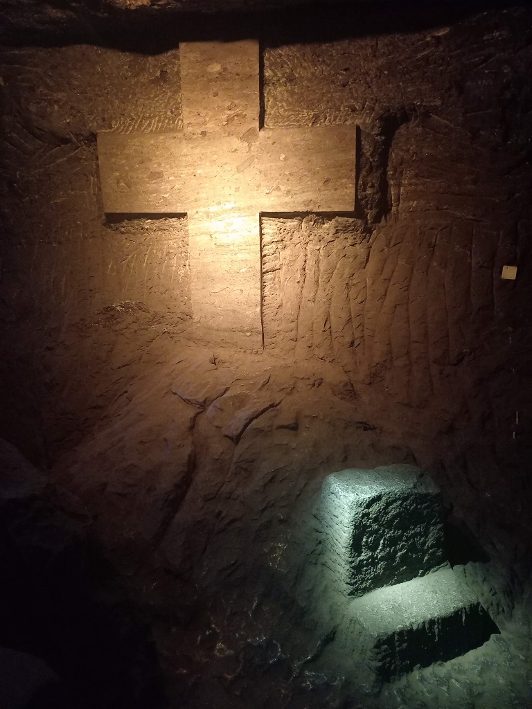 At the bottom of the nave, specifically within the sanctuary area, there is a 16-metre-high cross made of rock salt. Like the entire space, the cross is continuously illuminated with different colours.