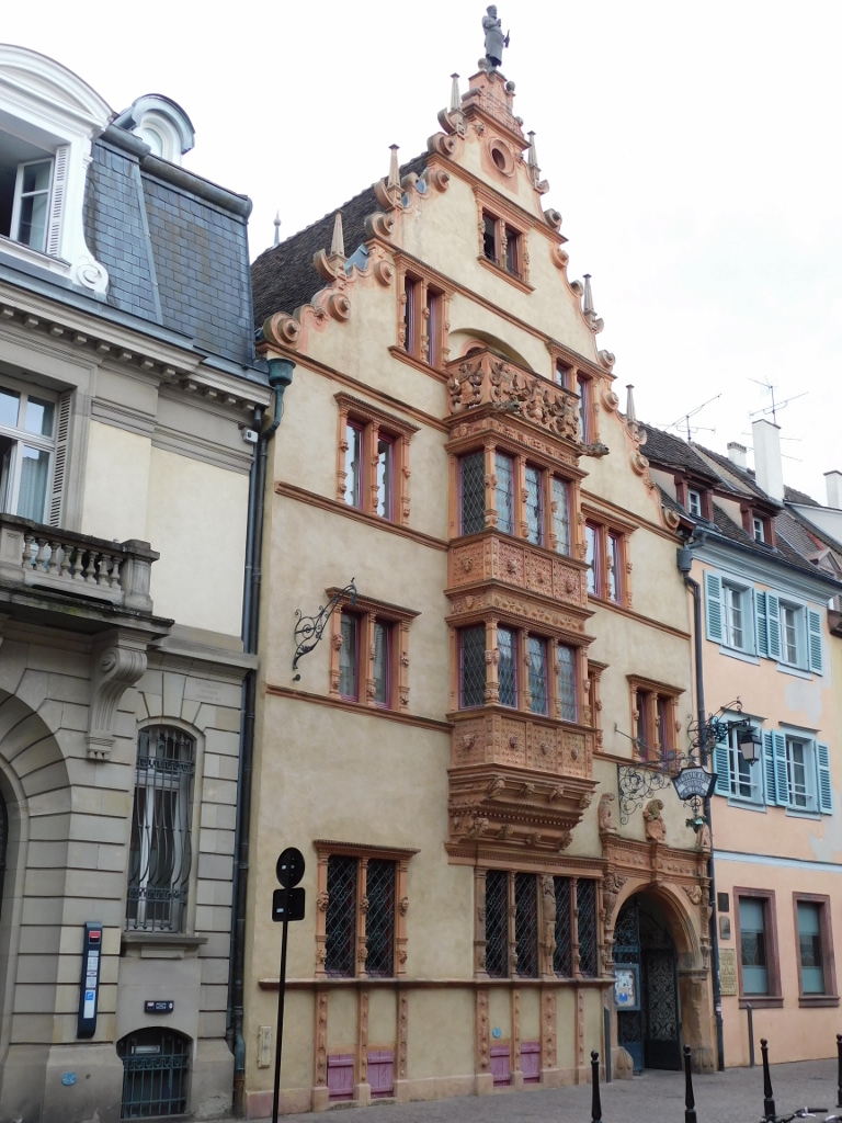 When I got to an extension of the street, a square, I would say, at the crossroad of Rue des Marchands and Grand Rue, from which I made the photo above, first I noted the Maison Kern from 1594, yet another example of the German Renaissance style in the town, that is located not far from this square.