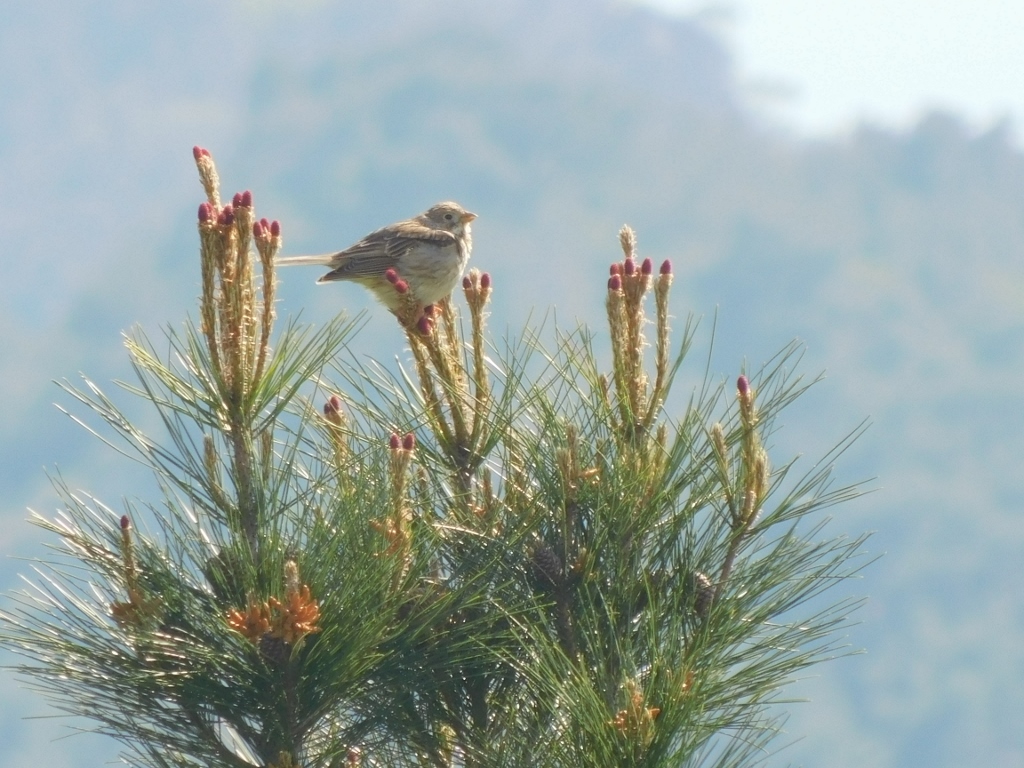 But, even at the lower levels, it was possible to see some birds. For instance, a nice corn bunting (Emberiza calandra) that adorned the top of a conifer tree close to the river.