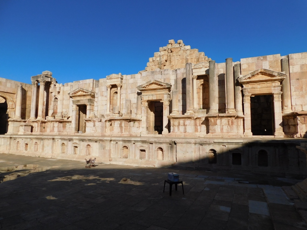The South Theatre is the biggest one in Jerash (out of three). It was built around the year 90 CE and it is estimated that it could hold around 3000 spectators. The stage had an opulently decorated back and it is presumed that it had at least two floors with Corinthian columns. Parts of the theatre were destroyed in the 749 earthquake and at the end of the 19th century the local population started to use the material from here in order to build their houses. Still, a lot has been saved and reconstructed.