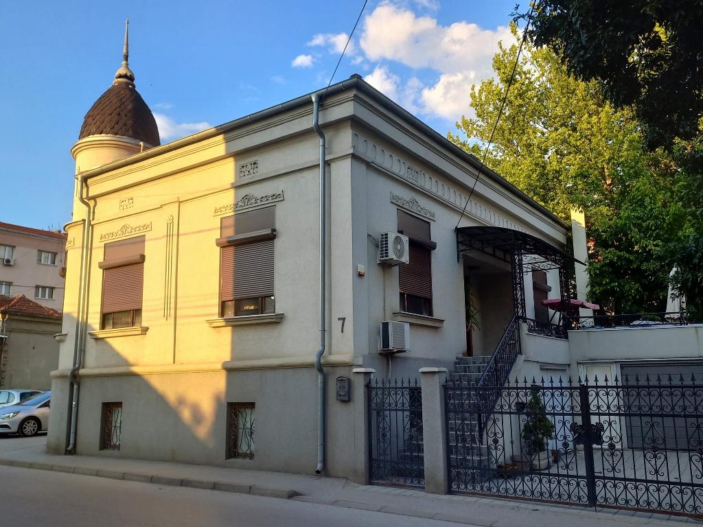 It was built in the early 20th century as a residential family house consisting of a basement and a raised ground floor, with a rectangular plan. The socle covering the basement level is made of stone blocks, while the exterior decoration is harmoniously executed. The house is accessed from the yard via a staircase leading to recessed entrance doors. From what I’ve read, those entrance doors are especially beautiful due to the rich carved decoration. This can be seen only partially in my next photo.