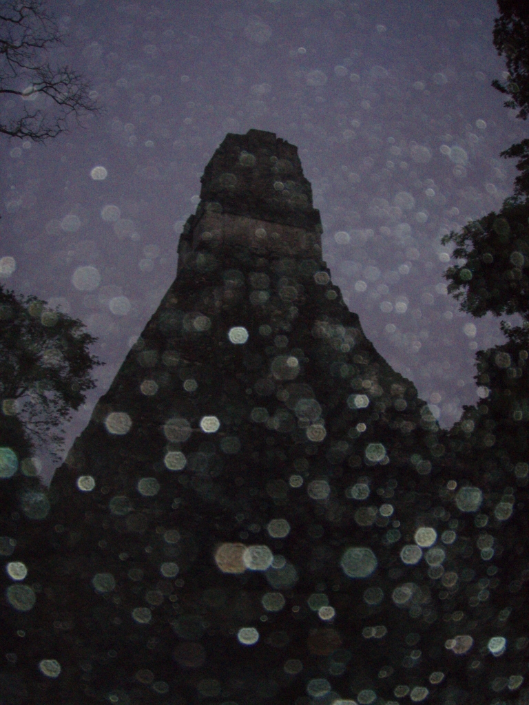 Different mini-buses brought a large number of visitors here from Flores and now the guides gathered us up and then we all moved. Led by the guides we walked quite briskly for we were to cover over 2 km to Temple IV that was the first on our sightseeing tour. Meanwhile it started to dawn and since we were walking across the Gran Plaza where there is a couple of famous pyramid-temples, I stopped for a moment to take a photo of one. Bearing in mind that it was still far too dark, I turned on the flash which I knew could not help me with the distant pyramid, but I wanted to give it a try anyway. In the end I was exceptionally content for I got a fabulous effect that illustrates the level of air humidity. One should bear in mind that it did not rain and it snowed even less, buy what is seen in the photo are water droplets that filled up the air.