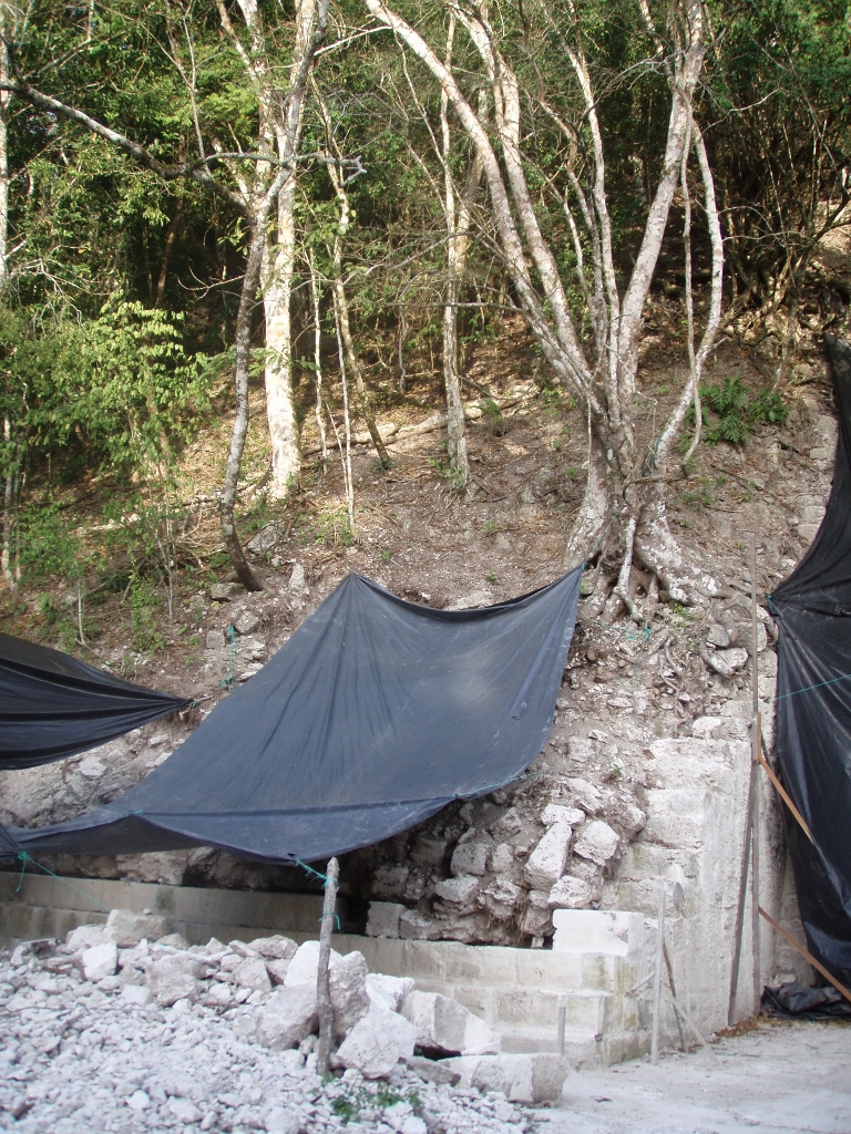 The photo above shows the place where the restoration works are ongoing, while the next one, in addition to showing a partially restored wall base, also shows what the site used to look like before the contemporary interventions. Although there are some parts of the temple-pyramid that still stand stable, a good share is ruined either because of the centuries of abundant seasonal rains or because of the roots of the trees that grow profusely on these structures.