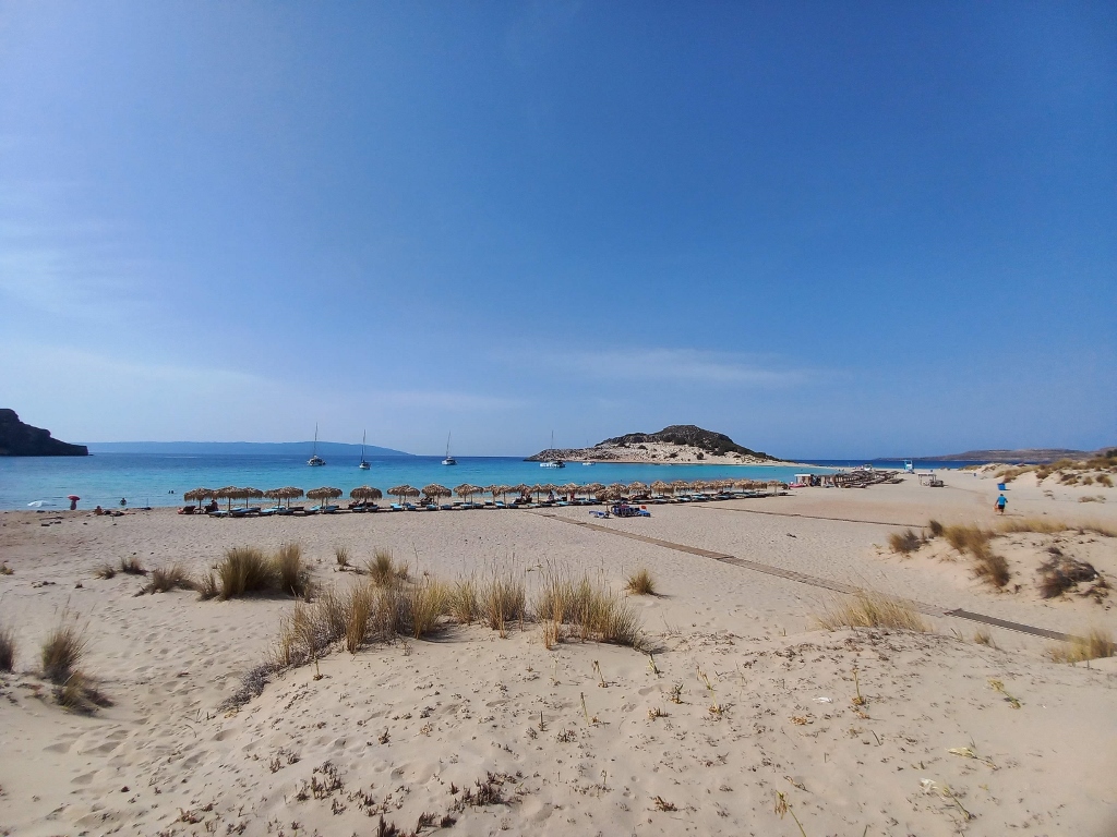 And yet, I first climbed up some sandy dunes here. On the one hand, I found it interesting and wanted to get a better look at some of the flowers growing there, while on the other hand, it allowed me to have a better view of the southern segment of Simos Beach.