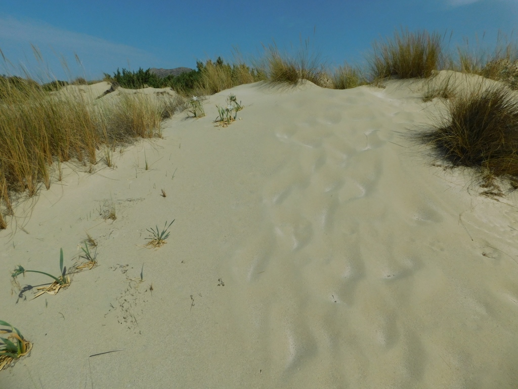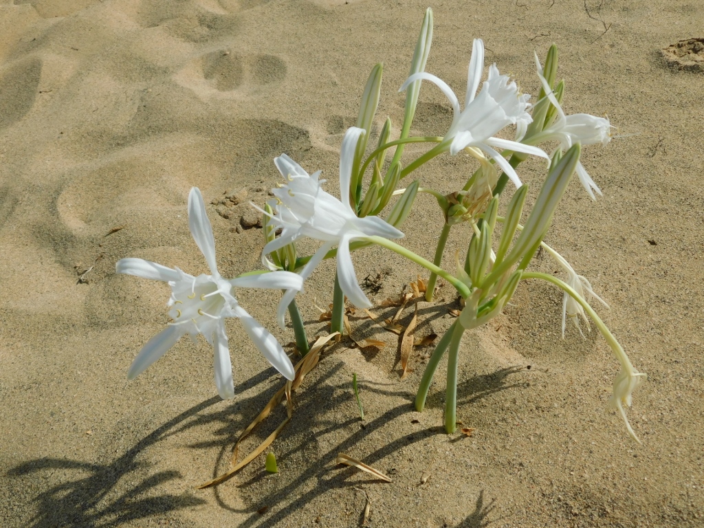 Here, on the sandy ground, beautiful sea daffodils (Pancratium maritimum) are growing.