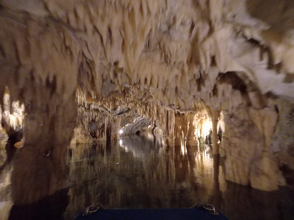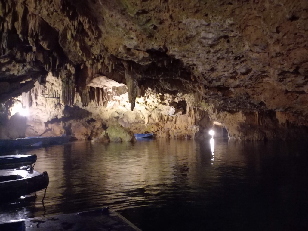 They consist of a series of halls filled with cave formations that have been carved by a river flowing underground through the limestone of the Mani Peninsula on its way to the sea. Today, this is one of the popular tourist spots in this part of Greece and everything is quite well organised. You purchase a ticket and then descend a set of stairs to a spot from which boats depart, after which you take a leisurely boat tour through about 2 km of the caves.