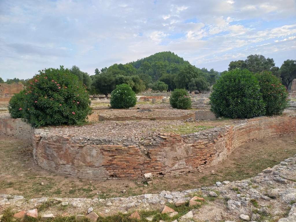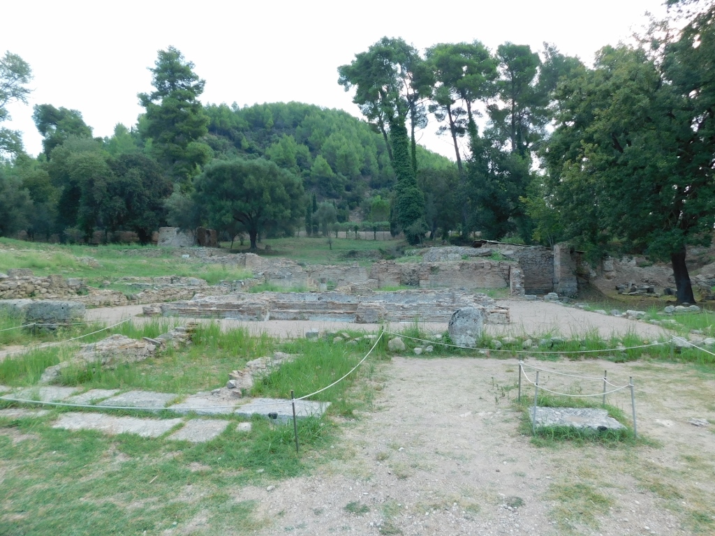 Today, it takes quite a bit of imagination to envision all of this, but the remains of the structure certainly seem intriguing and I enjoyed the lovely view of Kronion Hill. In the next photo, you can also see the remains of the pool in the centre of the building.