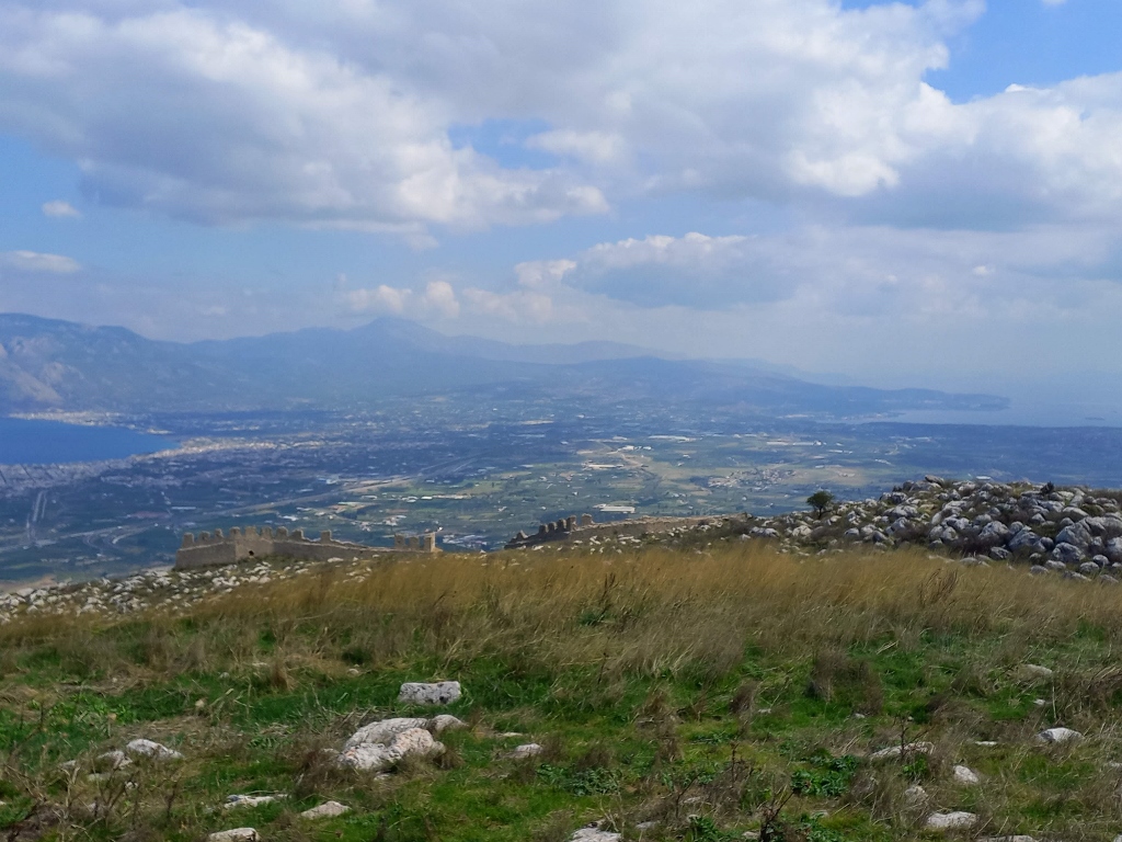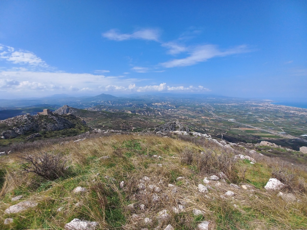 To start with, I drove up the hill and after leaving the car in the parking area, I began my visit on foot. However, I first went to a spot from which you can see a part of the views that stretch around from Acrocorinth.