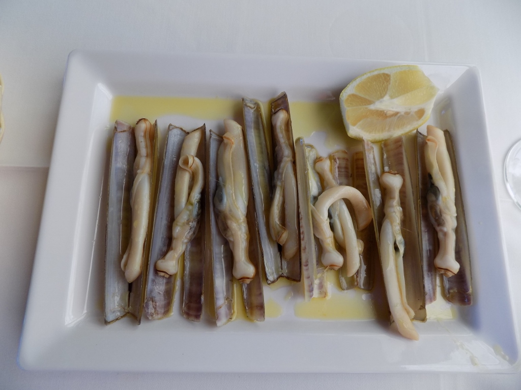 On the beach and close to my hotel, there was also a very good restaurant with sea food and since I had decided to relax, rest and give myself treats here, I went to the restaurant for lunch. It was crowded, but that’s the advantage when you travel alone –it is often easier to find the place for you. On this occasion I chose to try some shells I had not eaten before (longueirón, pod razors), and then I also had a wild sea bass. The shells were fantastic and the sea bass was rather standard.