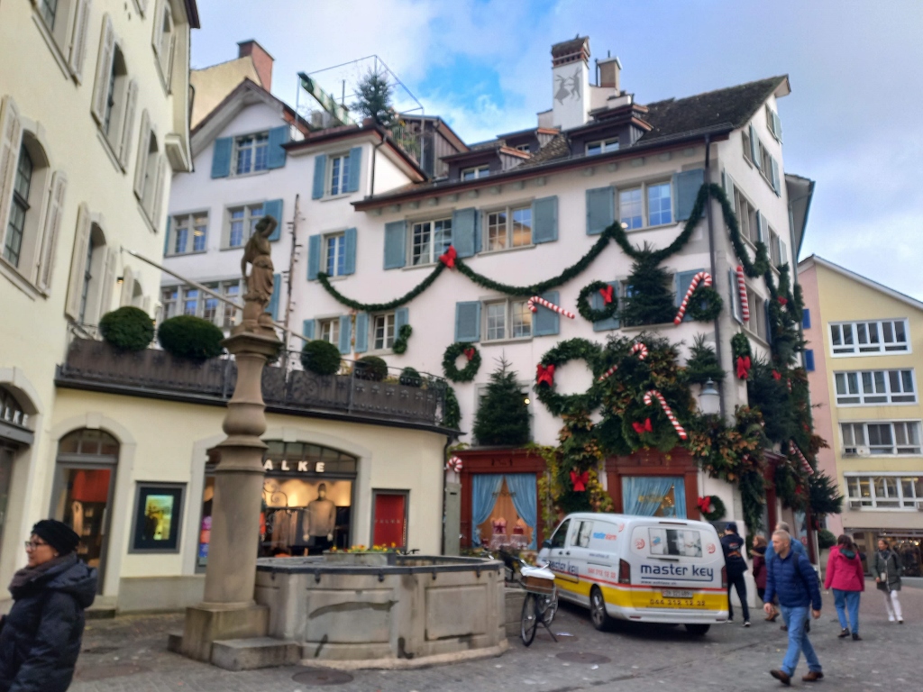 Instead, I made my way down to the famous square on the western bank of the Limmat River called Weinplatz. In the square, there is a particularly beautiful fountain featuring a figure of a wine-grower carrying a basket of grapes.