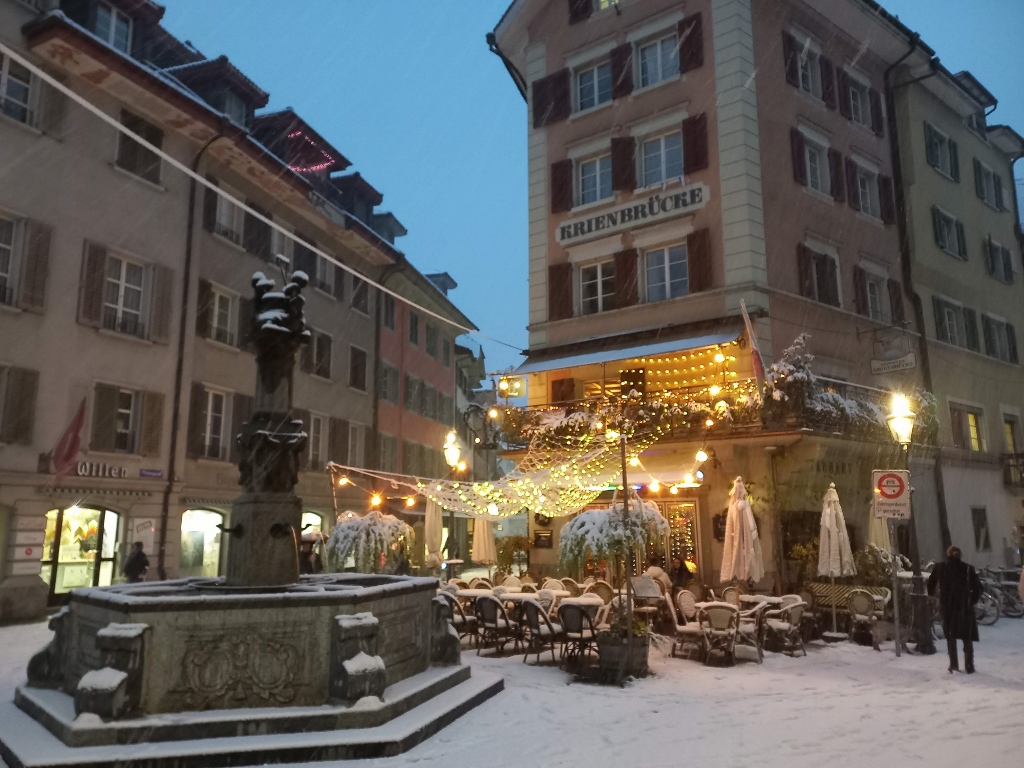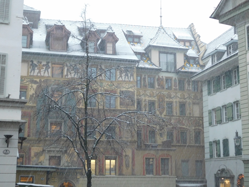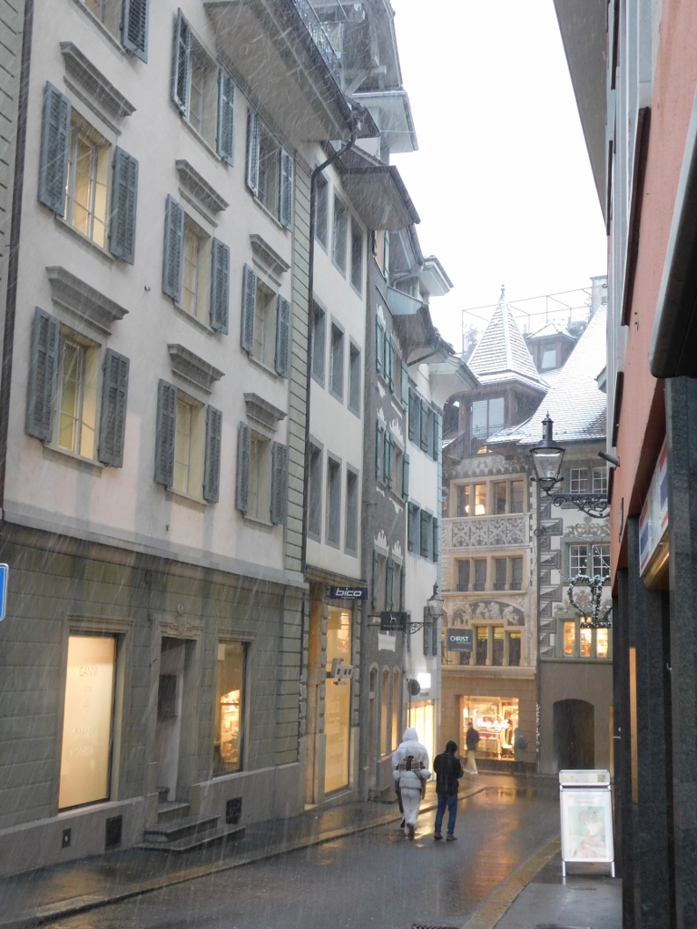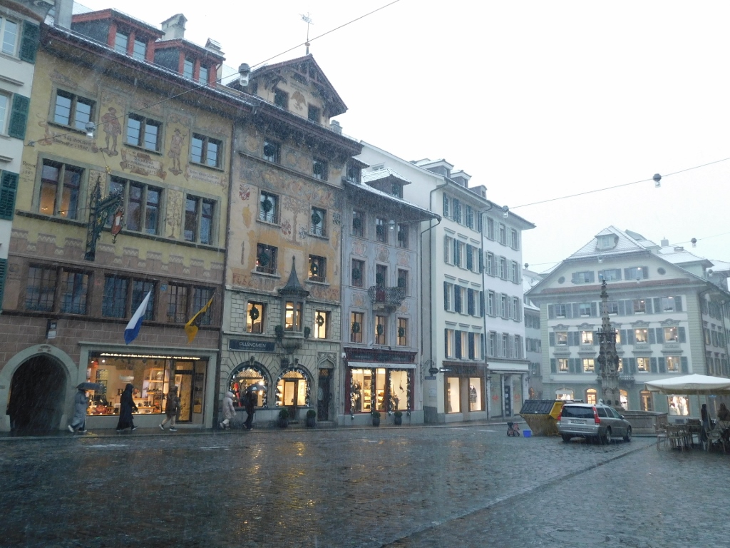 The charm of old Lucerne is contributed to not only by these painted buildings, but also by the streets and squares themselves. So, I came to Hirschenplatz square, and here I had to step into an entrance that led to a shop, just to be a little protected from the snow blown by the wind.
