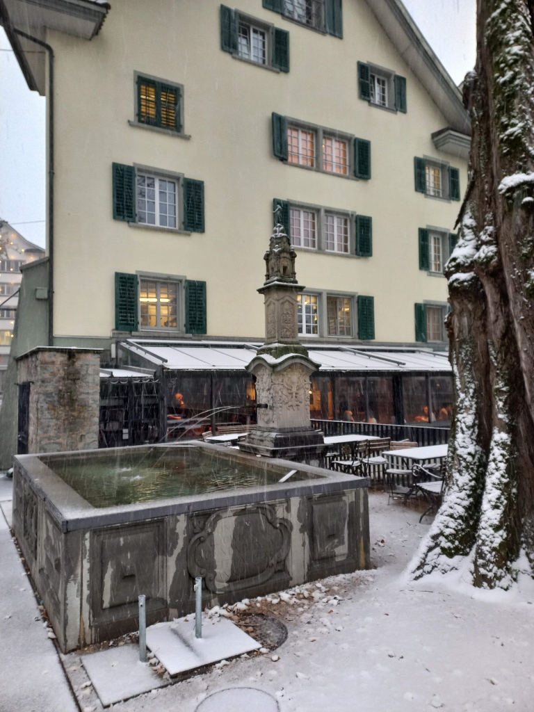 The Old Town in Lucerne is known for its buildings whose facades are decorated with murals. Not all buildings are decorated like this, but there are many and they truly look very beautiful. A partial problem I faced was the snow that was falling intensely, so I had to find places where I could briefly shelter myself so that the snow wouldn’t wet the camera or the phone, as then I would see more of a wet spot than what I actually wanted to photograph.