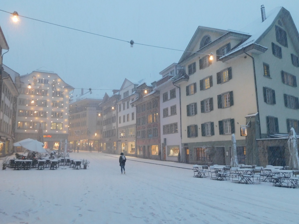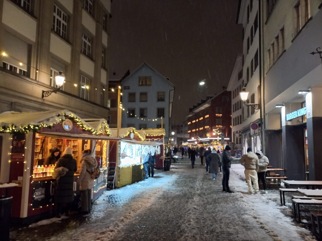 Before catching my train back to Zurich, I took a little walk around the small Christmas market set up near the station. Not all the stalls were open yet, but everything needed to make it picturesque was there – snow, lights and Christmas trees.