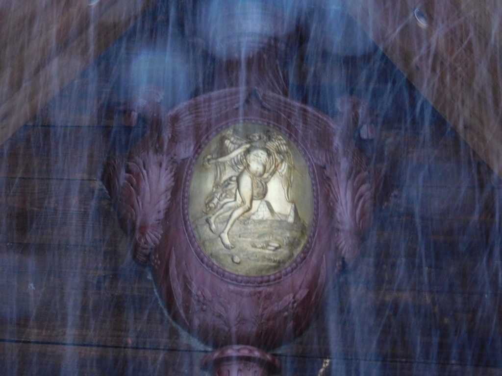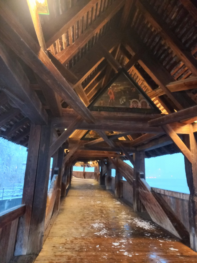 At the very entrance to the covered part of the bridge, there is a very beautiful medallion, which I barely managed to photograph because of the snow that was falling intensely.