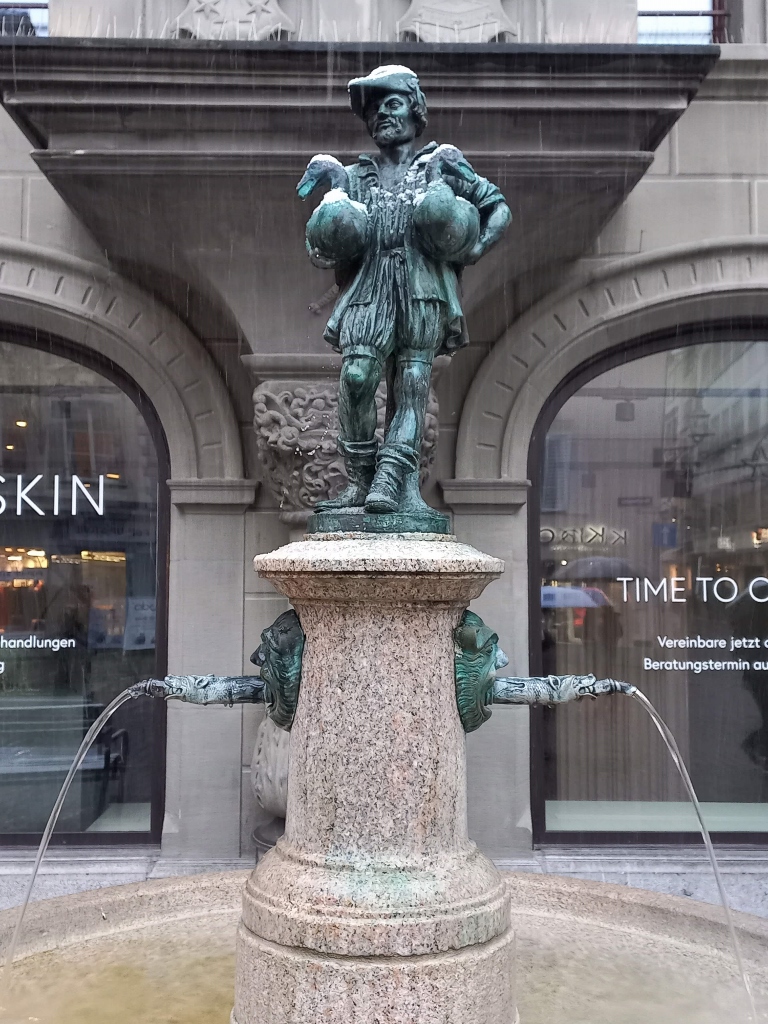 On this square, though a bit off to the side and in close proximity to the Reuss River, there is also a fountain. Despite the weather, the water flowed beautifully and unobstructedly from it. This is the Neptune drinking fountain.
