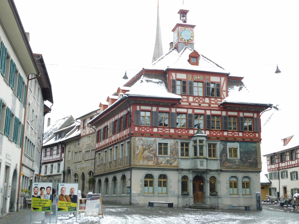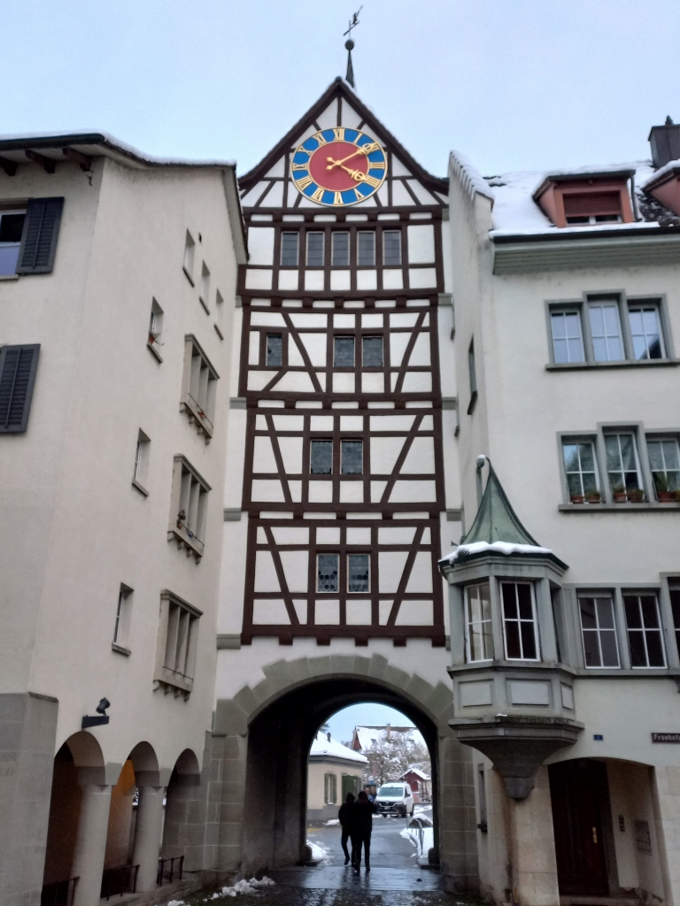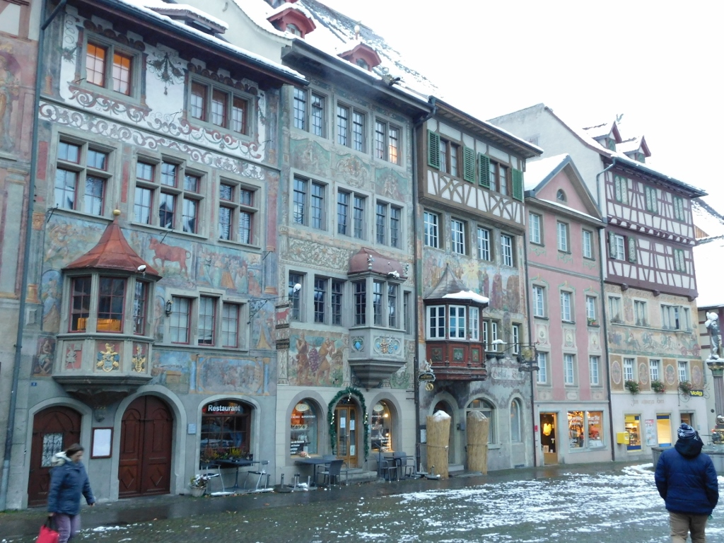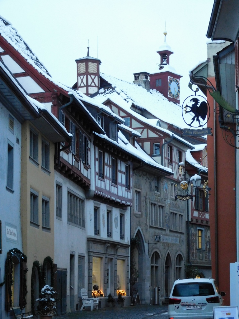 Since I was going back through Schaffhausen anyway, I decided to take a little walk again through the old town centre, which is very close to the train station. I thought that perhaps everything was already decorated for the upcoming holidays (I was there at the end of November), but it wasn’t. Aside from a few small huts set up in the central Fronwagplatz square, where mulled wine was mostly sold, there were no other active decorations in the town.