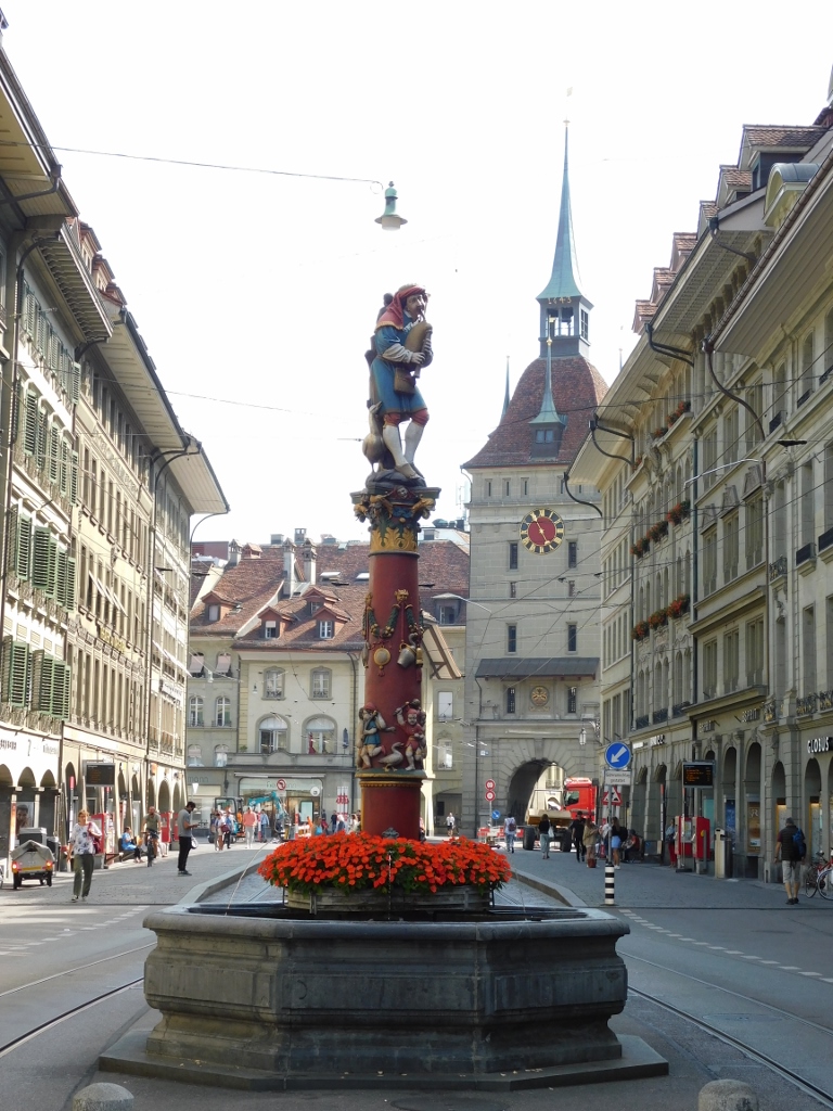 Na sred ulice kojom voze i automobili i tramvaji i gradski autobusi može da se vidi jedna od brojnih česmi u Bernu. Ova je iz XVI veka i na vrhu ima oslikanu skulpturu gajdaša.