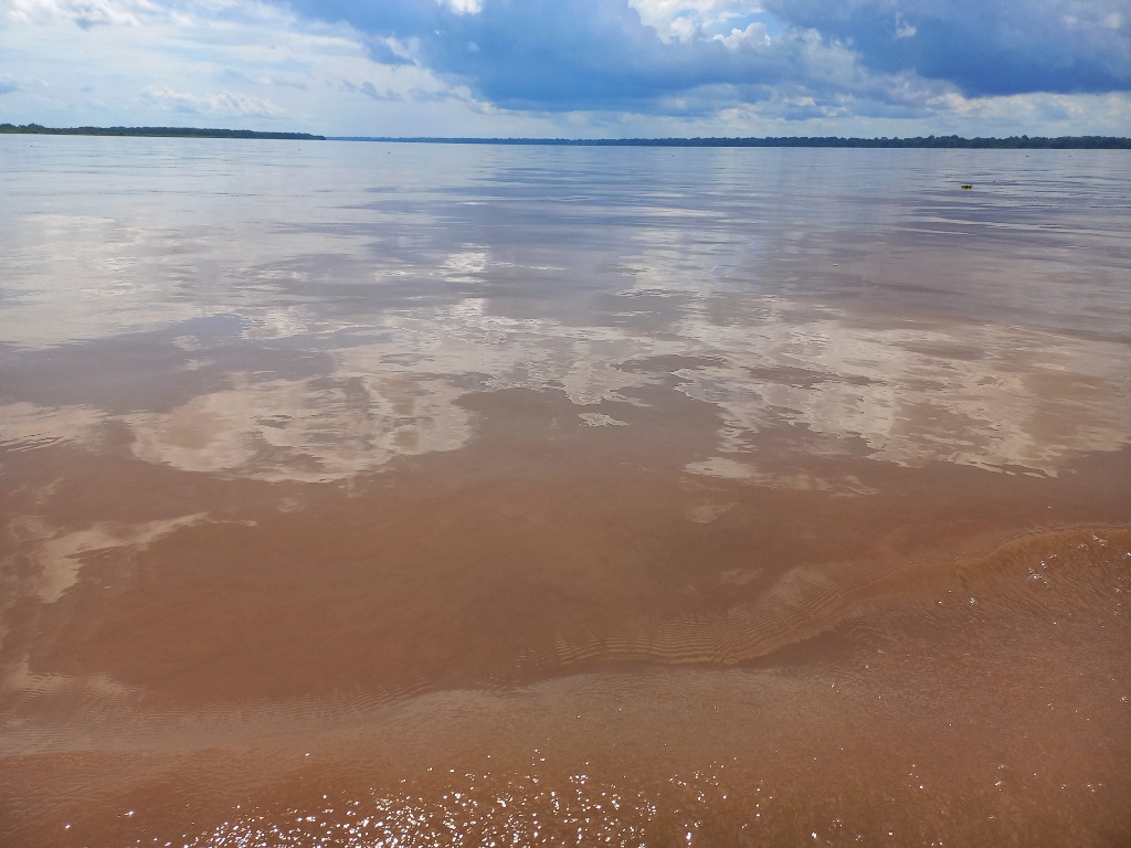 Levo i u sredini, gde je plutajuća vegetacija, je glavni tok Amazona, desno se vidi voda drugačijeg sastava i to je taj rukavac koji vodi do ušća reke Loretojako i „jezera“, a desno je pristanište u Puertu Narinju