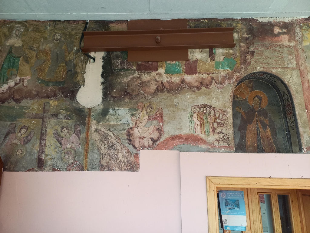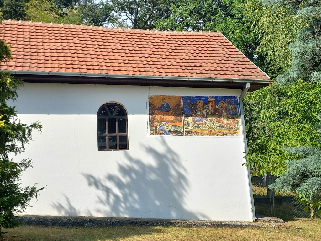 Sada da se malo pozabavim i graditeljskim elementima. Već je lako moglo da se zaključi iz moje priče i sa snimaka da je ovo jednobrodna građevina sa poluobličastim svodom. Na fasadama spolja može da se lako vidi da je crkva sazidana uz naizmeničnu upotrebu lomljenog kamena i opeke. Takođe se na severnoj strani vidi nekoliko zidnih slika za koje se pretpostavlja da su urađene kada se crkva obnavljala i kada je promenjena krovna konstrukcija, tj, 1693. godine.