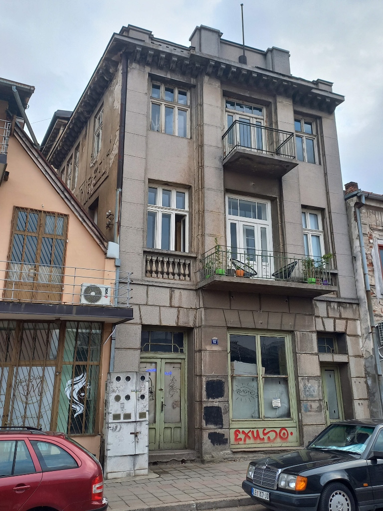 Kuća je podignuta početkom XX veka i, mada deluje da je u lošem stanju, na njoj se i danas mogu videti elementi fasadne dekoracije koja je bila popularna u vreme izgradnje. I ova kuća je imala stambeno-trgovačku funkciju, ali ne znam zašto i ona nije visoka „koliko je ulica široka“. Ipak, bez obzira na razliku u veličini i izgledu u odnosu na susedni objekat, sve ove kuće treba posmatrati kao deo specifične prostorno ambijentalne celine koja se razvijala u prvoj polovini XX veka (do Drugog svetskog rata).