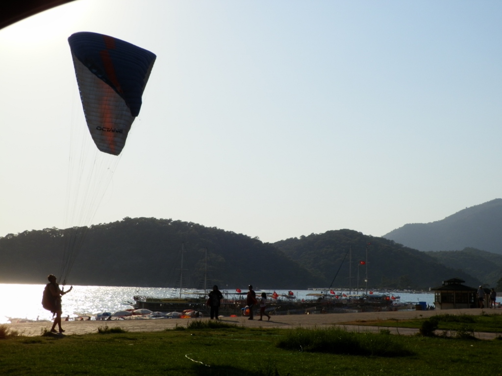 Ono po čemu je Oludeniz poznat jeste i letenje paraglajderom (sa instruktorom, naravno). Let kreće sa vrha planine Babadag, a sleće se na široko šetalište pored plaže koje se vidi na prethodnoj fotografiji. Ali, ljudi koji rade sa paraglajderima čitav ih dan nešto nameštaju, pa se često mogu videti u blizini obale.