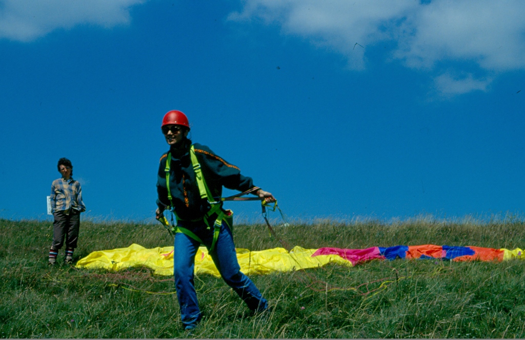 Dakle, na padinu se postavi paraglajdersko krilo, vas onda uvežu u remenje i kada ste spremni krenete napred i svi vam onda dovikuju: „Trči, trči...“, a ti imaš utisak da je iza tebe zid koji treba da pomeriš. Ali, ako uspeš da cimneš krilo dovoljno jako da ga uhvati vetar i digne ga, onda dalje trčanje nije problematično, ali tu su i drugi da pomognu i da te malo „poguraju“.