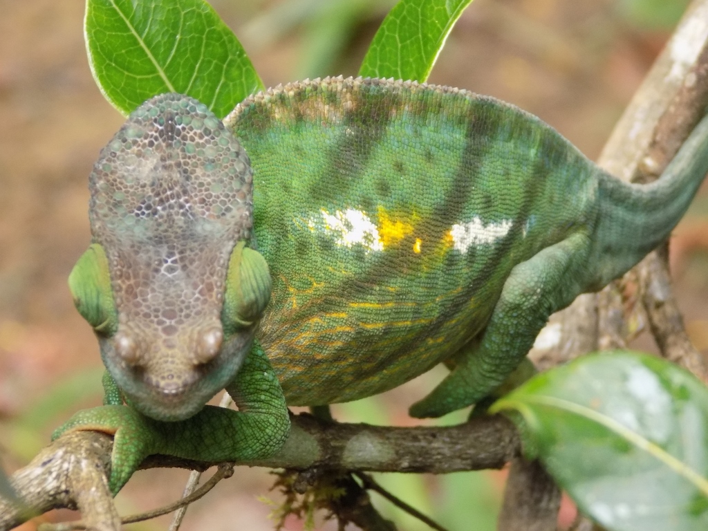 Dok smo mi išle i po stazama i van staza prateći Selenu vodiča, povremeno smo se susretale sa jednim lokalnim stanovnikom s kojim se Selena redovno pozdravljala i razmenjivala po koju reč na malgaškom. A onda smo ga srele kako dolazi iz pravca jednog manjeg proplanka, pa kada smo i mi tamo stigle, Selena je na jednom velikom žbunu ugledala jednog kameleona. Moram da priznam da je meni to sve bilo jako sumnjivo – i dan danas sam ubeđena da je taj čovek koga smo povremeno sretale u sred prašume tu doneo kameleona i smestio ga baš na tom mestu gde smo mogle lako da mu priđemo i da ga vidimo.