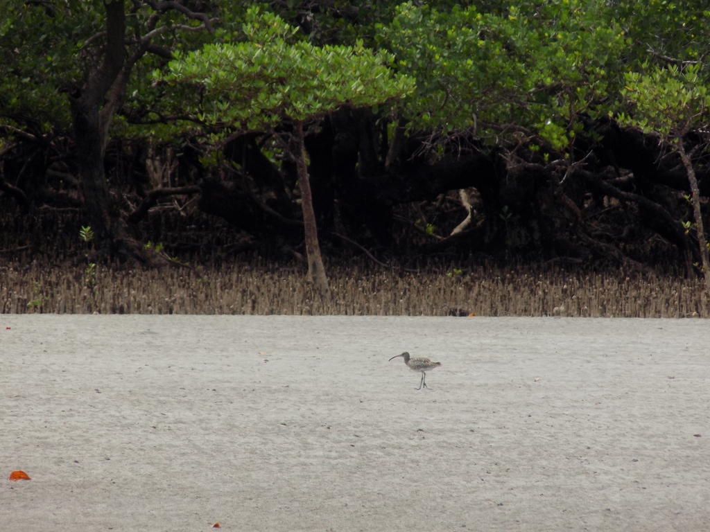 To vreme pre polaska na aerodrom sam iskoristila da ipak još malo odspavam i to mi je prijalo, a takođe sam malo i fotografisala sa terase. Još rano ujutru dok sam vitlala po usnulom imanju gde se nalazi hotel (u stvari su u pitanju dva paviljona sa sobama, plus još nekoliko objekata za različite svrhe, a između je zeleniš) u plićaku ispred naše terase i tog dela plaže pojavio se neki lokalni ribarski brod. Ujutru je voda bila potpuno mirna, kao ulje i prizori sa odrazima su bili divni. Dok sam ja dremnula malo i ponovo izašla na terasu, voda se skroz povukla, brod je bio na suvom i malo nakrivljen, a oseka kao nikada u prethodnih pet dana ogolila je delove dna koji se ranije nisu videli. U daljini sam videla neke ljude da hodaju po tim sprudovima, pa sam preko drvenog mosta otišla do kraja šume mangrova, a tamo se drvenim stepenicama spustila do peščanog spruda. Tu sam malo prošetala i videla da su te osobe koje sam spazila bile žene koje su u grupama i sa mrežama u rukama hvatale verovatno ribu, hobotnice ili neke druge morske životinje koje je oseka zarobila u nekoliko „bara“.