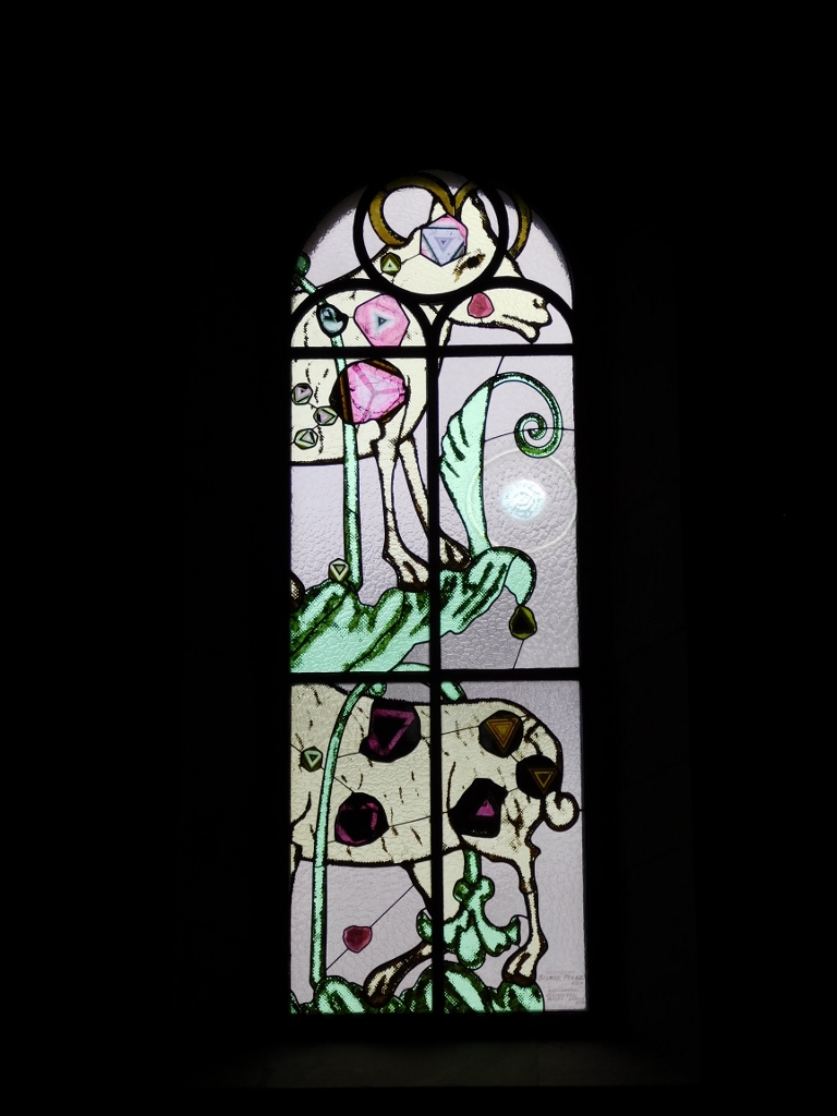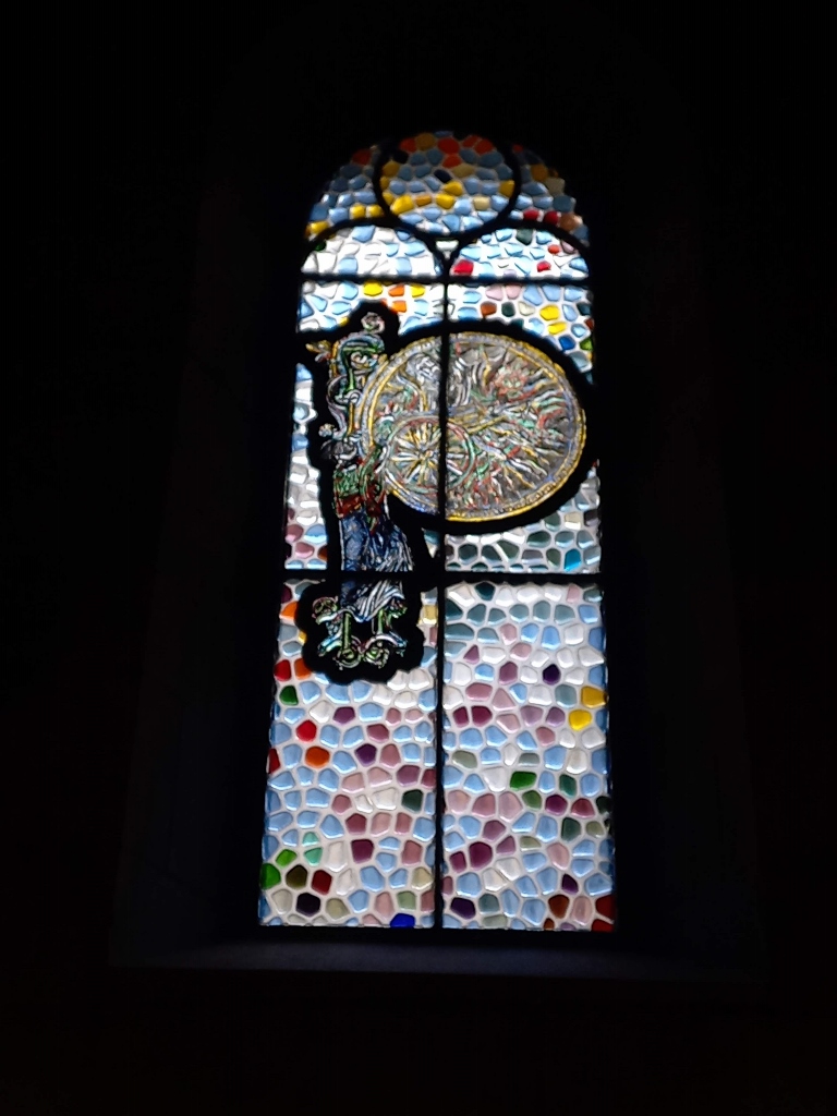 Meni su posebno bili zanimljivi vitraži. Oni u središnjem brodu su izrađeni 1932. godine, a na bočnim zidovima 2009 i to se i vidi kroz savremeni stil.