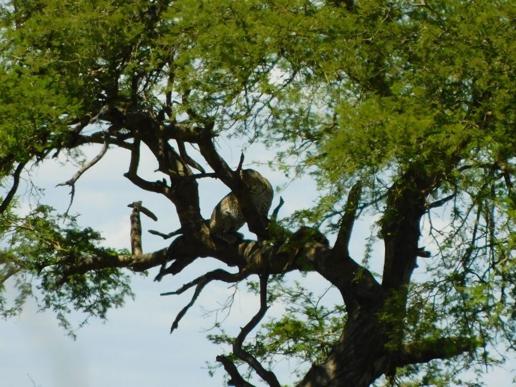 Ali, ono što je meni predstavljalo vrhunac, bez obzira što sam uživala u svakom trenutku ovog divnog izleta, bilo je nešto što je naš vodič ugledao u daljini. U početku nismo bili sigurni da li je to realno, ali se na kraju ispostavilo da jeste – bio je to jedan leopard (Panthera pardus) i to na drvetu. Pošto je drvo bilo prilično udaljeno od nas, ja sam koristila zum, ali uopšte nisam bila sigurna šta sam i kako uspela da snimim. Tek kada sam se vratila kući, videla sam da se na drvetu iza leoparda nalazi i sveža lovina. Očigledno je on bio jedan psihički zdrav i stabilan leopard koji zna za „odlaganje zadovoljstva“, tako da je lovina mirno čekala iza njega da bude pojedena.