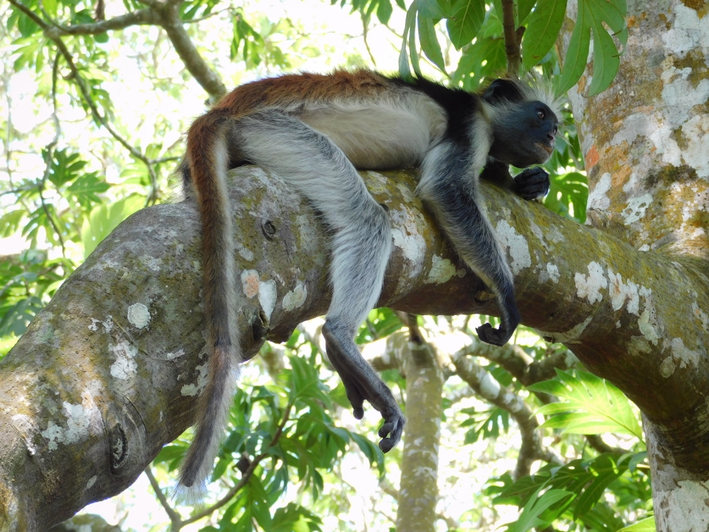 Posle šetnje po ovom prilično pitomom delu šume, prešli smo glavni put koji vodi kroz južne delove šume i krenuli da tražimo specijalne majmunčiće. U početku je delovalo da će potraga biti jalova, ali smo onda na par mesta naišli na zanzibarske crvene kolobuse (Procolubus kirkii) koji su endemski na Ungudži i koji su klasifikovani kao ugrožena vrsta. Utisak mi je bio da vodiči tačno znaju gde se ovim majmuni okupljaju, a pretpostavljam i da se majmunima ostavlja barem malo hrane na takvim mestima, baš da bi se osiguralo da posetioci mogu da „naiđu“ na njih.